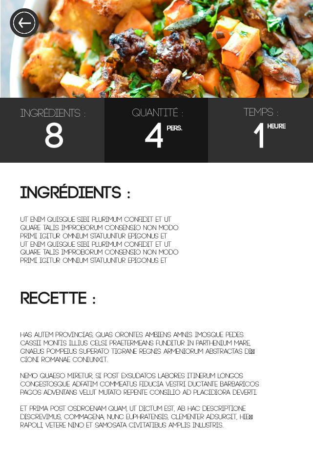 Dans le cadre de mes études multimédia, il est important d'être formé aux bases du Web Design, c'est pourquoi, même en filière jeux vidéos, nous continuons de nous exercer à la création d'applis et de sites fictifs, comme c'est le cas pour cette application culinaire ayant pour but de fournir des recettes de cuisine expliquées pas à pas.