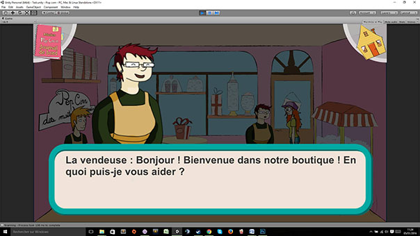 Notre objectif était de créer un support complémentaire au livre, accentuant l'immersion du joueur dans l'enquête menée par l'héroïne. Dans chaque niveau, le joueur collecte les informations dont il a besoin, auprès des différents personnages et objets du décor. Puis un QCM se charge d'évaluer son acquisition de connaissances durant le niveau.