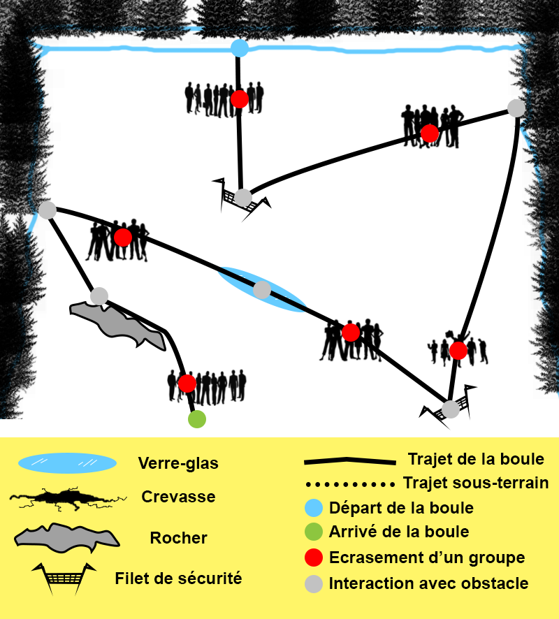 Le joueur ne contrôle pas la "tête", mais il dispose des obstacles le long de son parcours pour atteindre chaque groupe de skieurs.