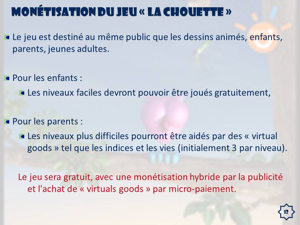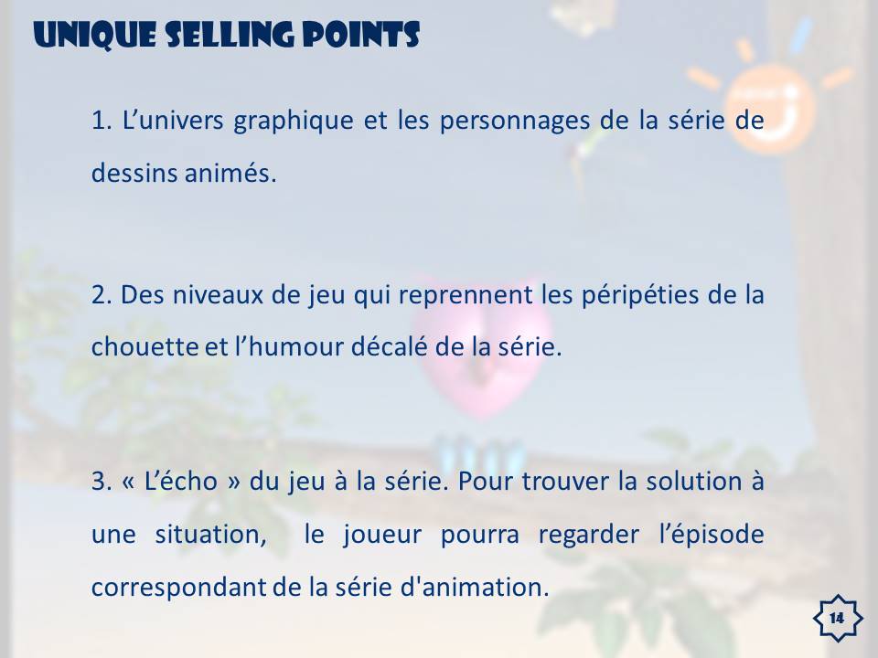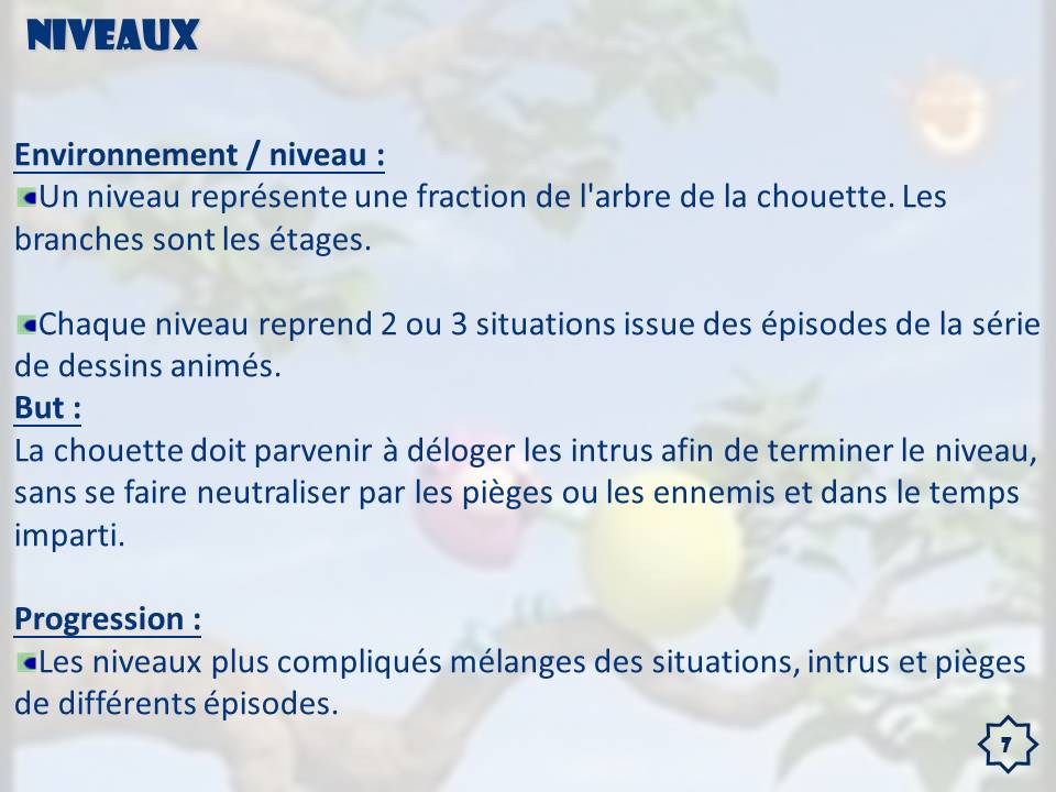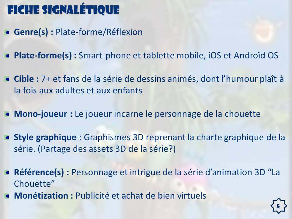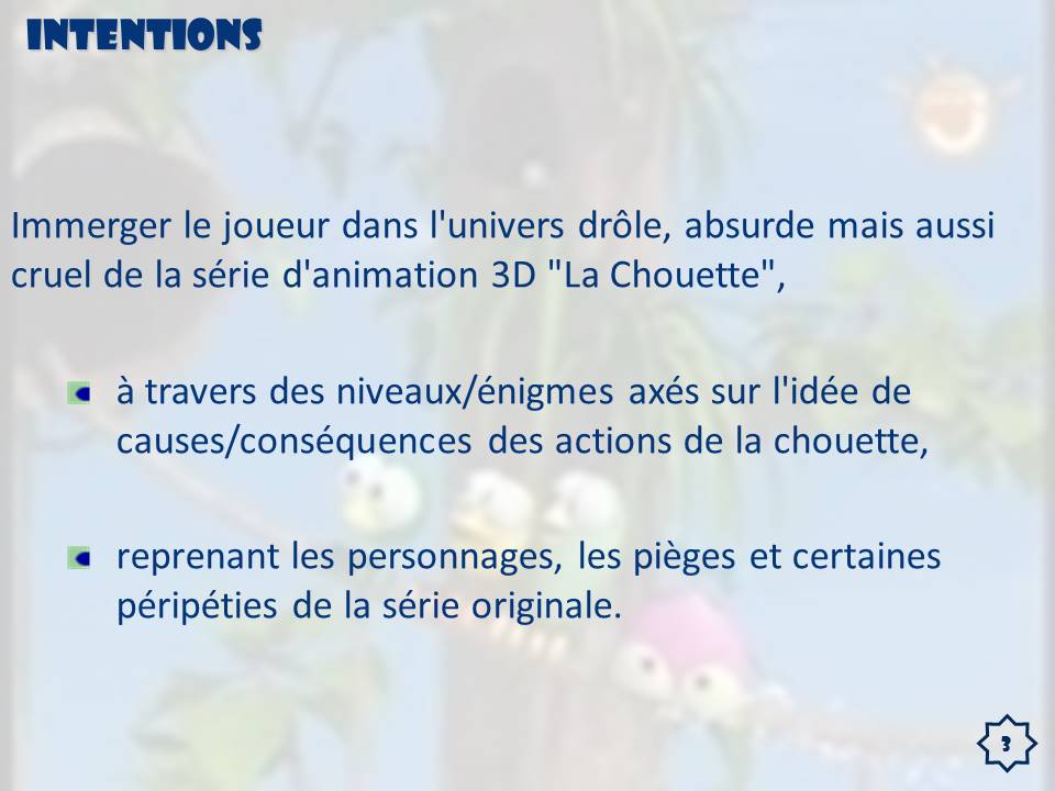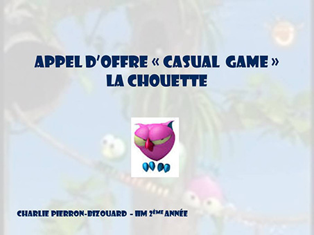 Voici une étude de cas, dans laquelle nous devions répondre à un appel d'offre et proposer un "Game Concept", reprenant le visuel et les règles, de la série d'animation 3D "La Chouette", maintenant diffusée sur France3 sous le nom "La Chouette & Cie".